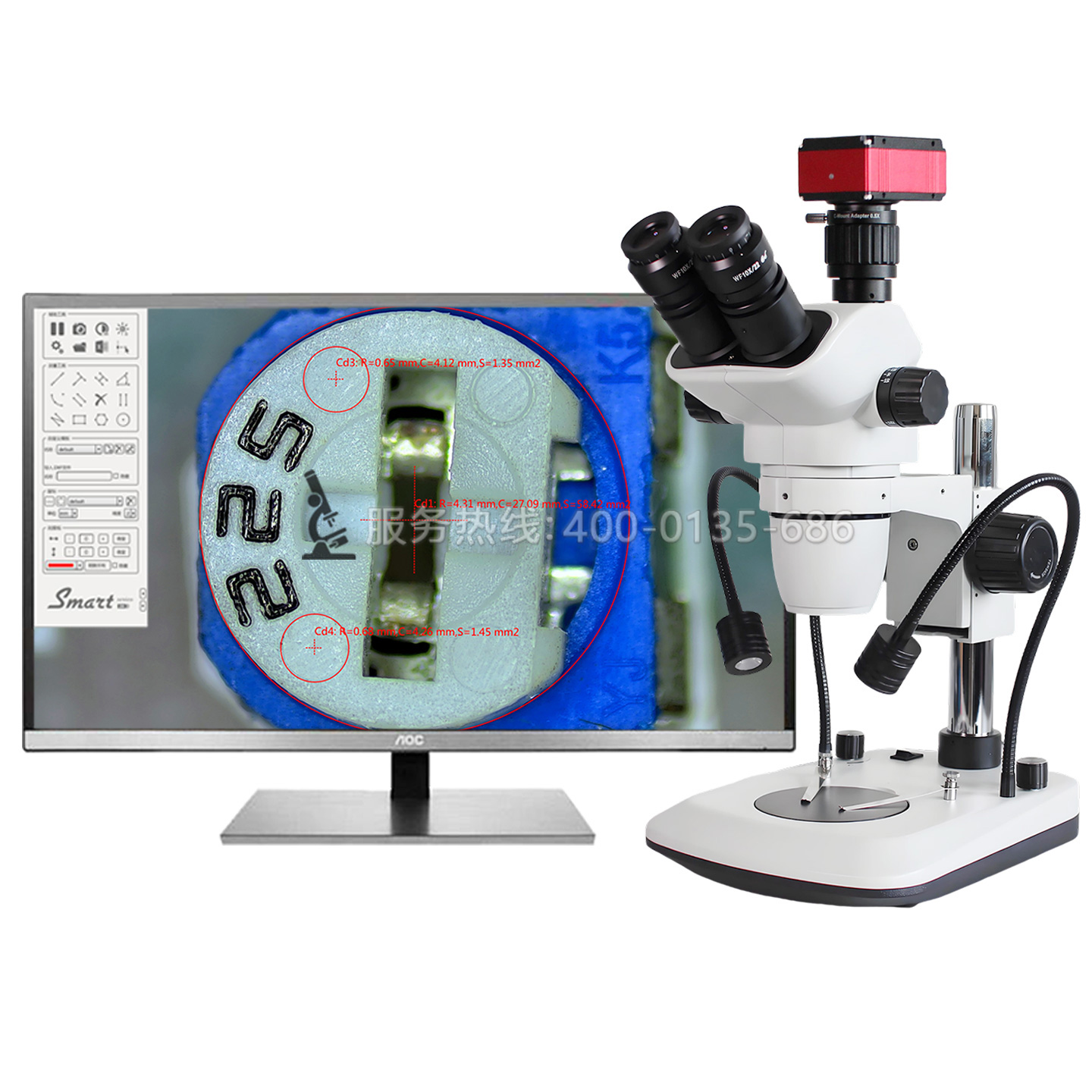 SRG-6555A三目雙側(cè)光源體視顯微鏡手機(jī)維修生物解剖 6.5-55X連續(xù)變倍,雙側(cè)LED光源角度可任意調(diào)節(jié),LED底光源