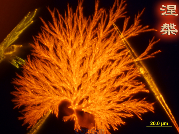 取圖儀器:Olympus BX51 軟件處理:Image-Pro Express 6.3 圖片介紹:本圖片是用溶液滴注法生長而成的單晶。將試劑溶于有機溶劑中,進行半小時的超聲處理,然后過濾,得到金黃色澄清溶液,滴在已經(jīng)洗干凈的修飾的硅片上,放置于稱量瓶內(nèi),慢慢揮發(fā),第二天即可觀察到圖片中的景象。
